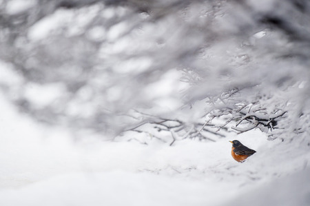 An American Robin red breast, Turdus migratorius, an iconic herald of spring caught in a late spring or early winter snow and ice storm