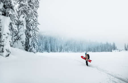 Man stands with a red snowboard in his hand next to a heavily snowy forest in foggy weather