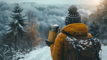 A winter hike with a thermos in hand admiring the snowy landscape and taking breaks to drink warm honey lemon tea