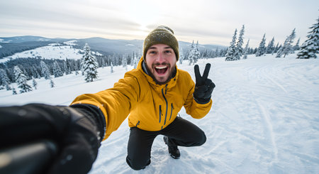 Cheerful man dressed in yellow winter jacket taking selfie in snow