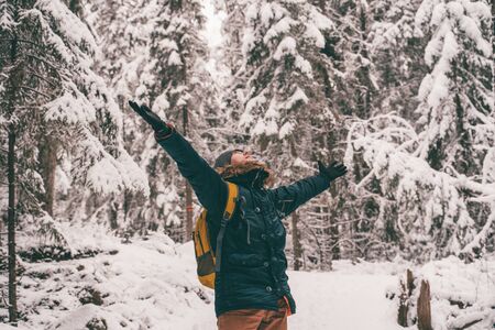 Photo of man with hands up for walk in winter forest.