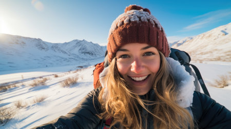 Traveler influencer taking selfie during travel in winter season backpack on alps mountain comeliness