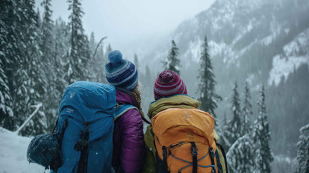 Two friends embrace the beauty of winter hiking, surrounded by towering snow-covered mountains and evergreen trees, enjoying the thrill of outdoor adventure.