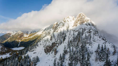 Idyllic winter scenery of evergreen forest on the mountain in winter snowy day. Aerial. High quality photo