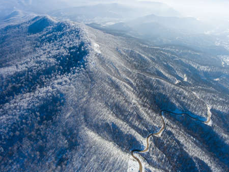 Aerial view of winter mountain road in the woods.