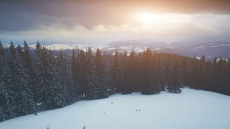 Sun over pine trees at snow mountain aerial. Nobody nature landscape. Spruce forest at hoarfrost. White snowy ranges. Winter vacation. Undiscovered Carpathian mounts, Bukovel Resort, Ukraine, Europe