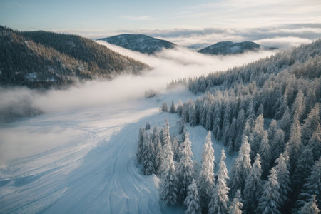 An aerial view presents a snow-covered mountain landscape with evergreen trees. The scene is enveloped by a layer of fog, while a soft sunrise bathes the peaks and clouds with gentle hues. This imagery is suitable for various applications, including editorial and commercial projects.