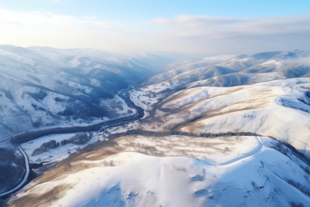 Aerial view of winter mountain landscape with river and blue sky.