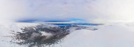 Panoramic view of the mountains in the clouds. Beautiful winter landscape.