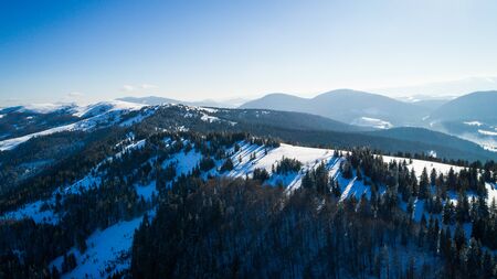 Aerial view sunny beautiful landscape of winter hills and mountains with forest thickets on a frosty winter evening against a blue sky and the setting sun. Place for advertising