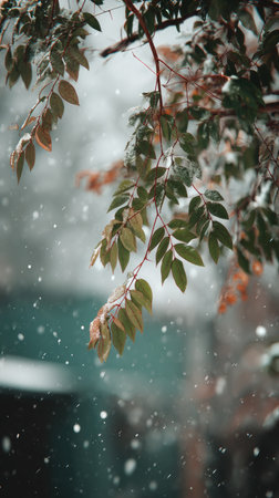 First snow falling gently on a tree, a few snowflakes drifting slowly and settling on the leaves; fresh air, natural.