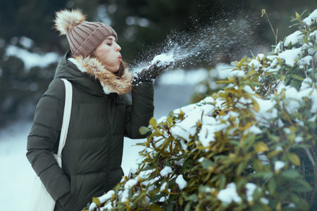 modern middle aged woman in green coat and brown hat outdoors in the city park in winter with mittens and beanie hat blowing snow near snowy branches.