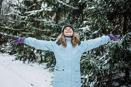 Hello winter, happy wintertime. Happy young curly woman with hands raised up celebrating winter snow standing in snowy forest and watching on falling snowflakes near Christmas trees.