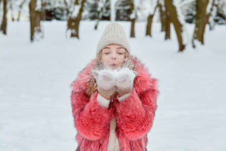 A beautiful young woman in winter will blow the snow off her mittens. Pink fur coat and white knitted hat. A cold, snowy winter.