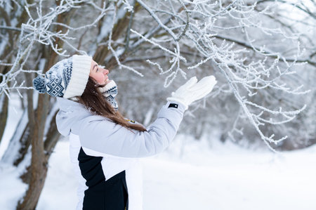 Young woman touching snowy tree branches in winter park. Calm winter lifestyle, connection with nature, cold weather and peaceful seasonal leisure