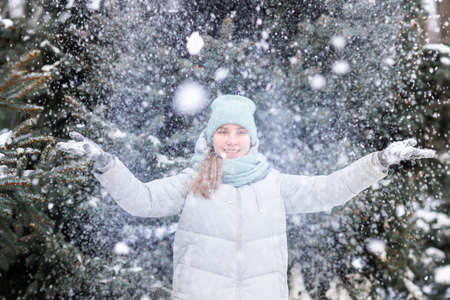 Smiling attractive young woman have fun under falling snow wearing warm clothes and blue stole in snowy winter forest.