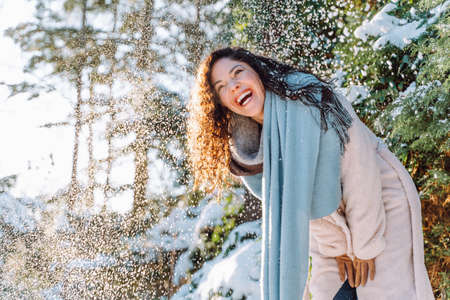Happy laughing young woman in winter warm clothes having fun, fooling around, throwing snow while walking in city park or forest outdoors. Winter fun, leisure on holidays. People lifestyle concept