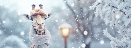 Giraffe in winter. Portrait of a majestic giraffe. Beautiful giraffe on a blurred background with copy space. Generative AI
