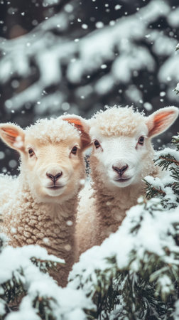 Two lambs in snowy forest, close-up portrait. Winter nature and wildlife concept