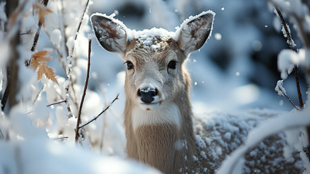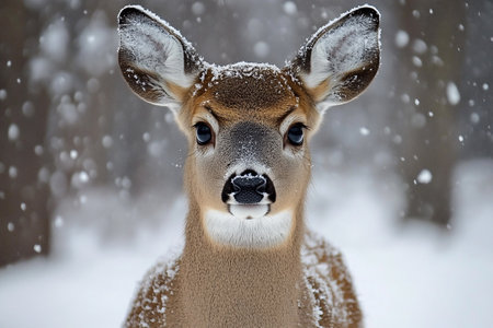 This close-up portrait highlights a snow-covered deer amidst a serene winter forest, capturing the delicate beauty of wildlife in a tranquil setting.