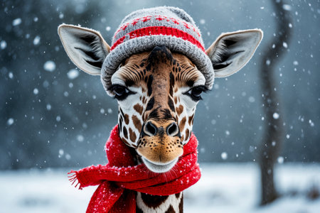 AI Generative Giraffe portrait in knitted winter clothes hat and scarf, animal in snowfall in winter