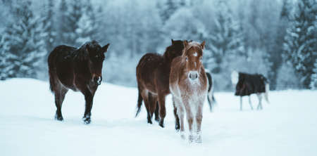 Icelandic horses on a snowy field in winter. Icelandic horses in winter.
