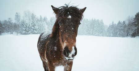 Beautiful group of horses gathered in a snowy field, with a close-up of one horse covered in snowflakes