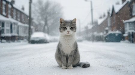 A charming grey cat sits gracefully in a snowy street, surrounded by a tranquil winter landscape, evoking a sense of calm and peacefulness in the neighborhood.
