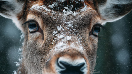This stunning close-up captures the gaze of a deer in a serene winter landscape, showcasing intricate details of its fur and snowflakes. Ideal for nature lovers.