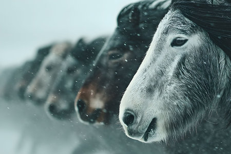 A group of horses navigates through a snow-covered landscape, embodying strength and resilience. the focus on the foreground equine highlights detail in their snowy coat, while the blurred background adds depth and movement to the wintry scene. Generative AI