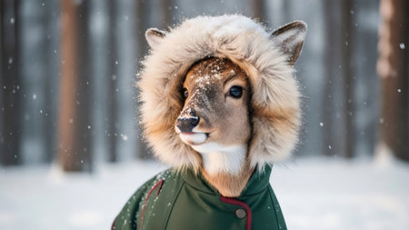 Deer wearing winter jacket with fur hood in snowy forest. Funny animal photo for Christmas greeting card or winter holiday design.