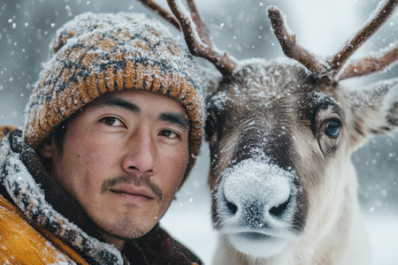 A man with a warm hat stands beside a reindeer in a snowy setting. Snowflakes fall gently around them, highlighting the serene atmosphere. Both appear calm, emphasizing a connection between humans and nature during winter.
