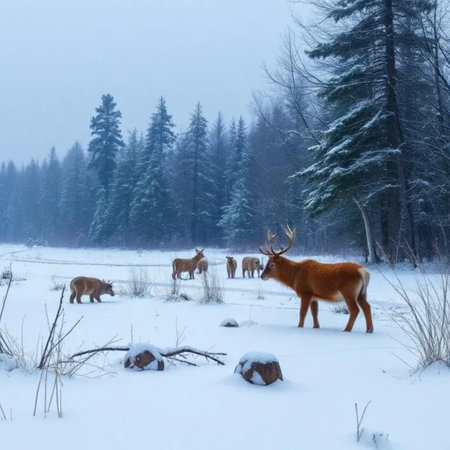 A majestic stag stands in a snowy forest, surrounded by other deer, showcasing nature's beauty in a serene winter landscape.