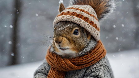 A funny squirrel with big cheeks, dressed in cozy soft gray warm clothes, a hat and a scarf in a winter theme. Seasonal wallpaper.