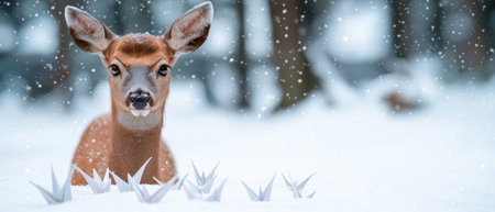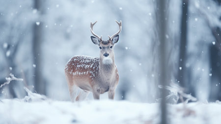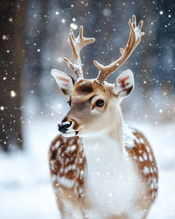 Beautiful young deer standing in a snowy winter landscape with snowflakes gently falling around it, creating a serene and magical atmosphere