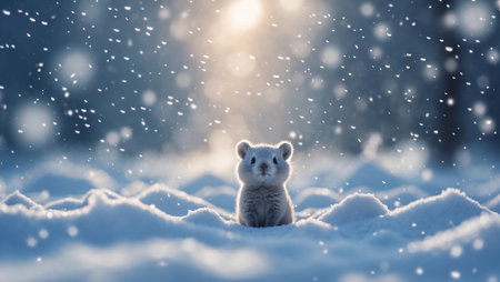 An arctic fox sits peacefully amidst falling snowflakes in a winter wonderland
