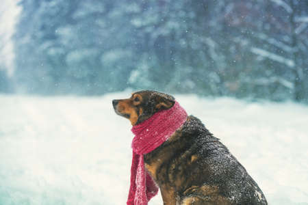 Portrait of a dog with a knitted scarf tied around his neck, sitting in a blizzard in the forest