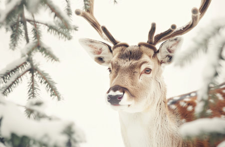Close-up of a deer in a snowy forest. Concept of wildlife, winter nature, animal portrait, serene landscape.