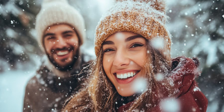 Outdoor portrait of cheerful handsome bearded man and pretty girl enjoying the snowfall in winter forest. Young couple in love. Christmas holidays, New Year, Valentines day.