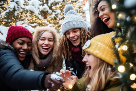 A group of friends celebrates winter in a snowy location, sharing laughter and joy while snowflakes gently fall around them, creating lasting memories together. Generative AI.