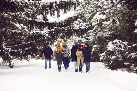 Diverse young people enjoy walk in snowy forest on winter holidays. Friends in outerwear spend vacation outdoors relax play snowballs in park. Beautiful nature weekend. Friendship concept.