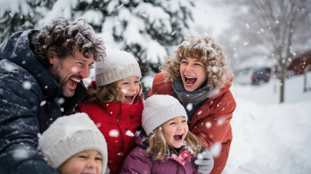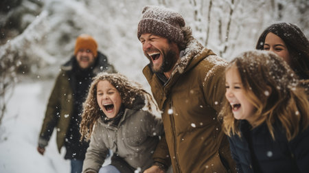 Kids and parents laughing during snowball fight in the forest, happy winter time