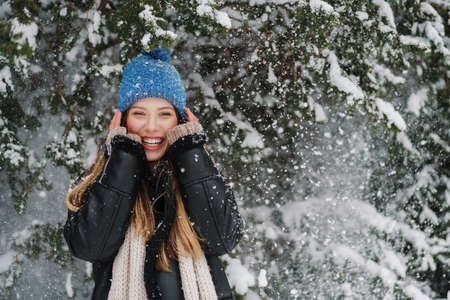 Happy beautiful girl in knit hat making fun with snow while walking in winter forest