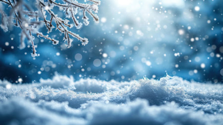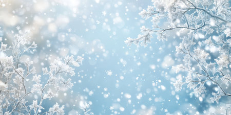 Frosty winter background with icy branches, glistening snow, and a bright blue sky.