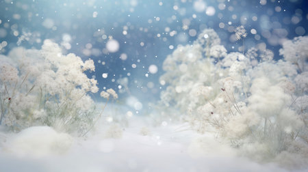 This enchanting winter scene captivates with delicate snowflakes drifting against a serene blue backdrop, perfect for holiday themes that evoke warmth, joy, and delight during the festive season