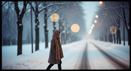 A person walking on a snowy street lined with trees, soft bokeh lights in the background, winter atmosphere