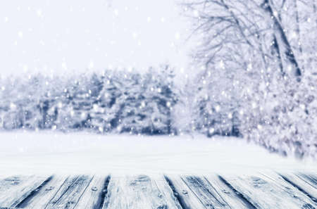 Wooden table with winter forest background. Christmas and New Year concept