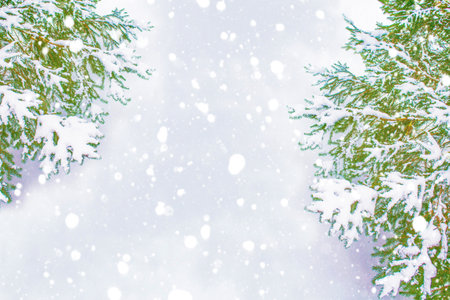 Frozen winter forest with snow covered trees. outdoor. pine branches.