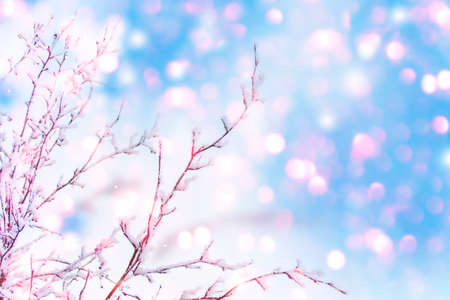 Winter nature background with frozen branches in snow and sunlight