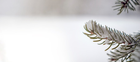 Winter panorama pine branches with snow and frost on a light background for decorative design